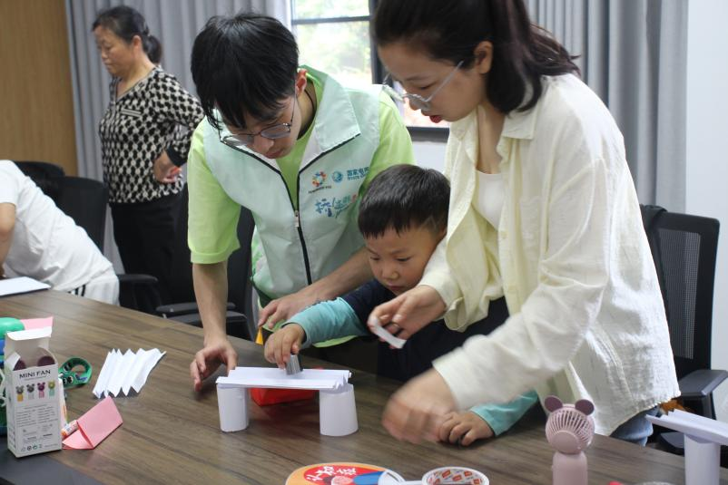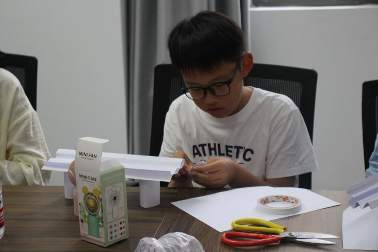 “原来薄薄的纸也能变成大力士!”一位小朋友兴奋地展示自己的作品。首场实验课中,生工2302班陈嘉浩同学以“纸桥承重”为主题,带领孩子们用普通A4纸搭建桥梁模型。“如何用最轻的纸承载最重的砝码?”他通过问题引导孩子们思考力学结构设计,讲解并展示了折叠、拼接等技巧。孩子们积极动手,折出不同的桥梁形状,反复测试不同桥型的承重能力。第二堂课中,生工2304班张玉廷同学将复杂的“细胞呼吸”知识转化为趣味实验。他指导孩子们在塑料瓶内倒入白醋,向气球中装入小苏打,当气球套上瓶口后,两种物质反应产生二氧化碳气体,瞬间将气球“吹”得鼓鼓的。“这就是细胞呼吸产生能量的过程!”张玉廷用生动比喻解释生物原理。孩子们看着逐渐膨胀的气球,眼神都亮了起来。此刻,科学的种子已然播撒在他们心中。
