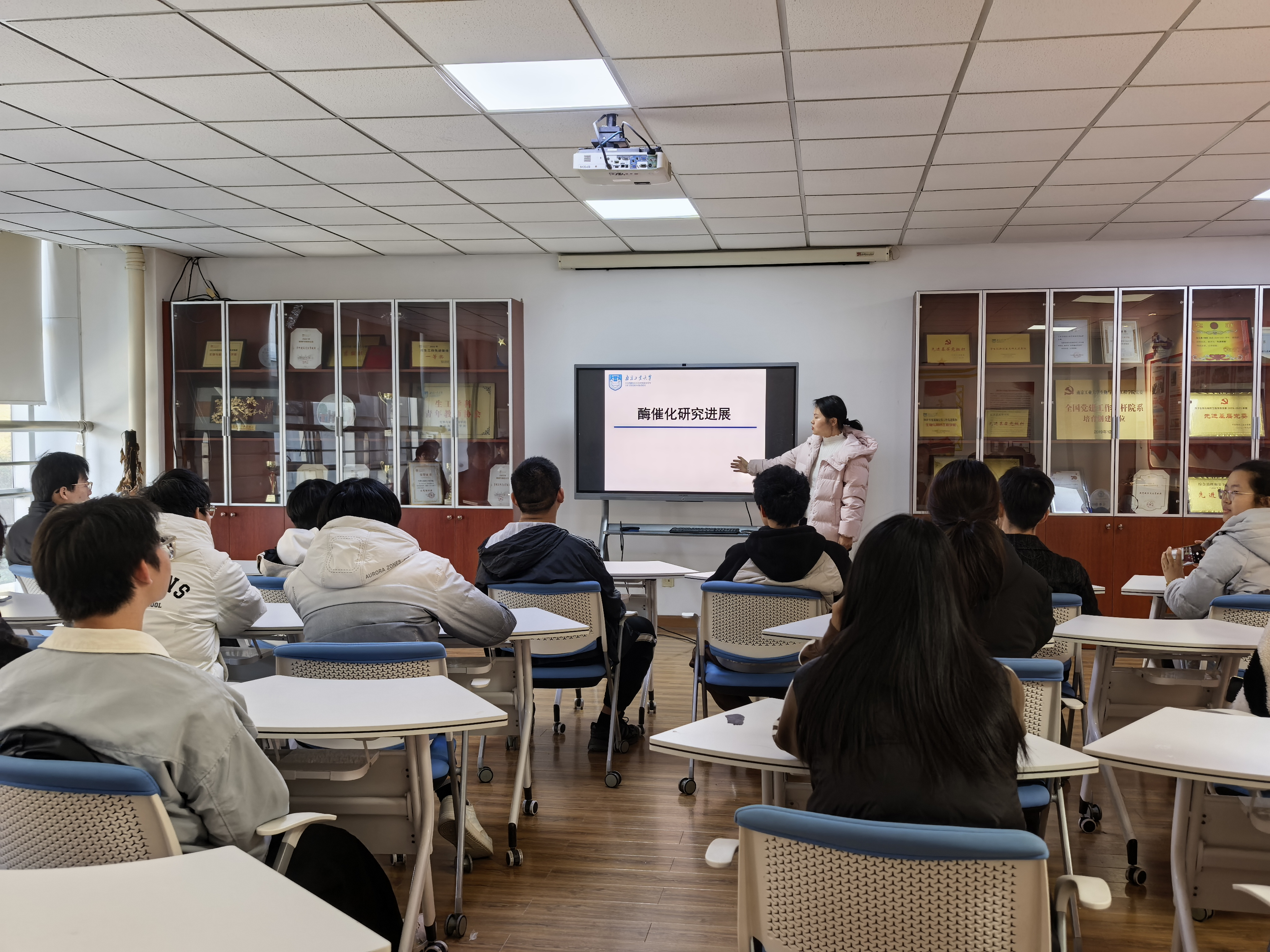 讲堂内容兼具学术深度与实践价值,为同学们带来了一场“学术盛宴”。胡老师从多维视角展开分享,系统梳理酶学发展关键脉络,聚焦现代酶学、应用、改造及生物技术应用四大核心模块,展示了酶催化研究的前沿动态、发展逻辑与技术应用。
