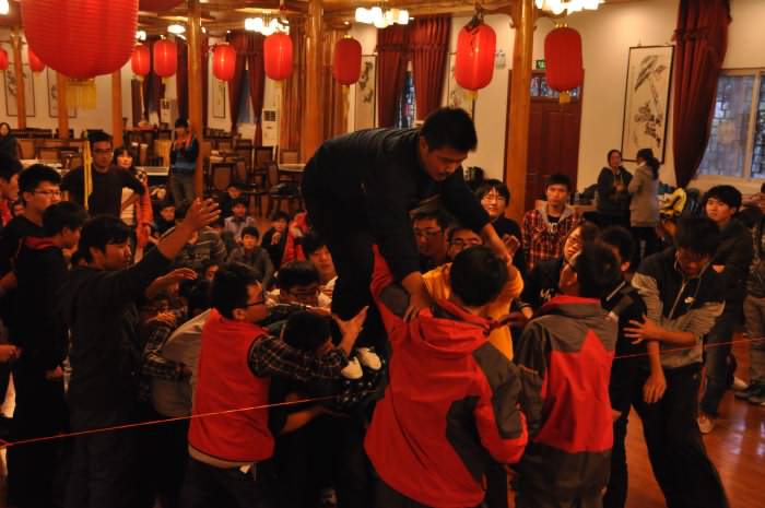 开营仪式以后,专业的素质拓展教练指导同学们随机分成若干小组,自行设计队旗、队标和队歌,开展了一系列有趣的活动。诸如“信息传递”,“水的故事”,“制胜七巧板”,“抱团打天下”等。在这些活动中,为同学们模拟了各种不同的“社会环境”,通过对同学们每个人的表现,来揭示当今社会职场中遇到的问题。同学们专心活动,兴致很高。尤其是最后的挑战项目:“抱团打天下”,更加反映了我院同学团结一心、众志成城的良好团队表现。由于其规则的约束,参训同学先后失败了七次,一次次的失败,一次次的挫折,非但没有磨灭参训同学的士气,反而更加燃起了参训同学“精诚所至,金石为开”的高昂斗志。男生为女生搭起通向胜利的桥梁,男生与男生则互相协作。那一刻,参训同学167颗真诚的心紧紧的相连在一起。在一声声“生工,加油!!!”的助威声中,所有参训同学突破重重困难的考验,圆满完成了训练任务。最后,同学们与辅导员班主任老师一同用《团结就是力量》的嘹亮歌声结束了为期一天的素质拓展训练。