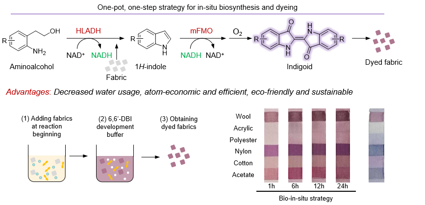 研究进一步通过全细胞催化体系将该合成途径应用于织物染色。在重组大肠杆菌中共同表达HLADH与mFMO,可在合成染料的同时,利用生成的无色靛白中间体直接对浸渍于反应体系中的纤维进行着色,从而实现生物合成与原位染色的同步完成。该集成策略不仅显著降低了染料生产过程中的水耗与废水排放,而且展现出优异的底物普适性。朱晨杰其在原子经济性、E-factor等方面的评估结果也表明该路线具备良好的应用前景。