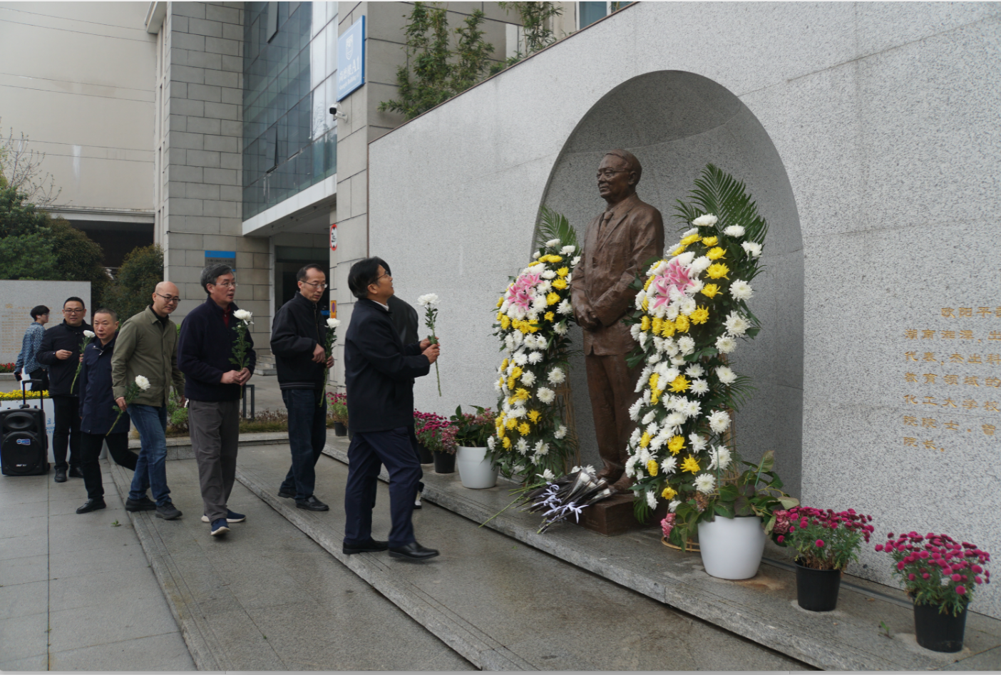 活动现场全体人员整齐肃立,向欧阳院士铜像静默默哀后三鞠躬,以表达深切悼念与崇高敬意。随后,师生代表缓步上前,依次敬献鲜花,以朴素而庄重的方式寄托哀思、缅怀先贤。